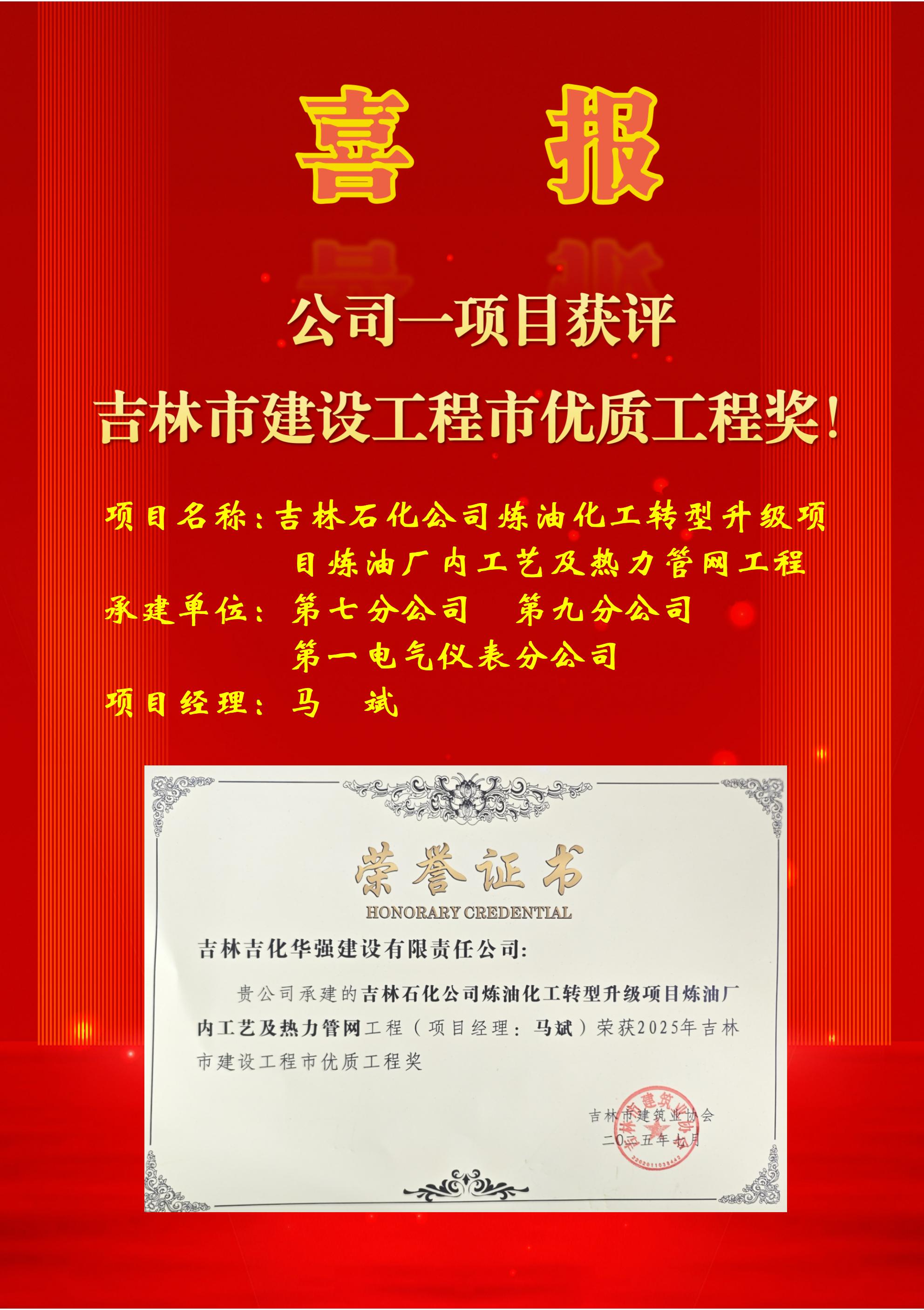 喜报|公司一项目获评吉林市建设工程市优质工程奖!