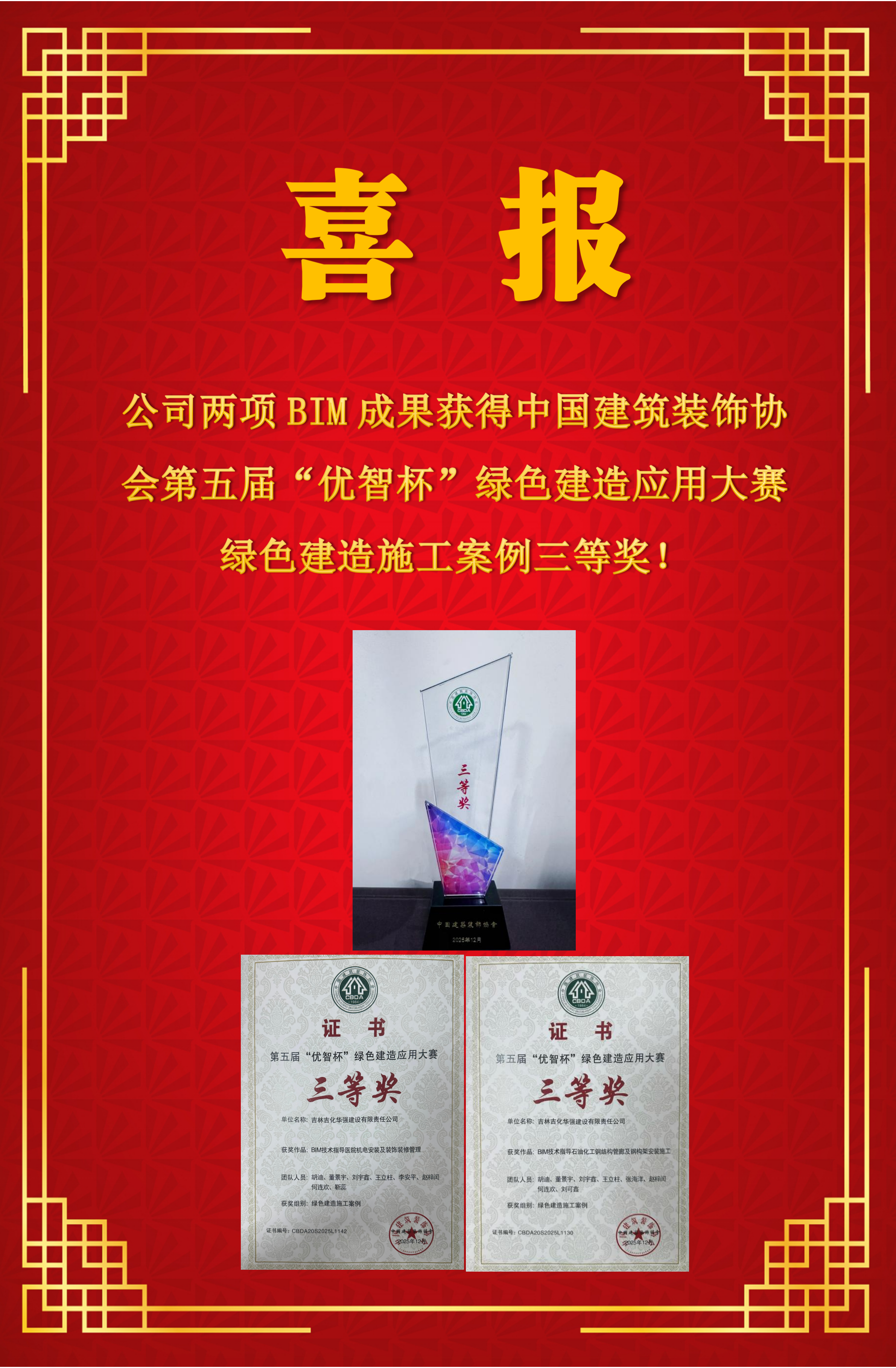 喜报|公司两项BIM成果获得中国建筑装饰协会第五届“优智杯”绿色建造应用大赛绿色建造施工案例三等奖!