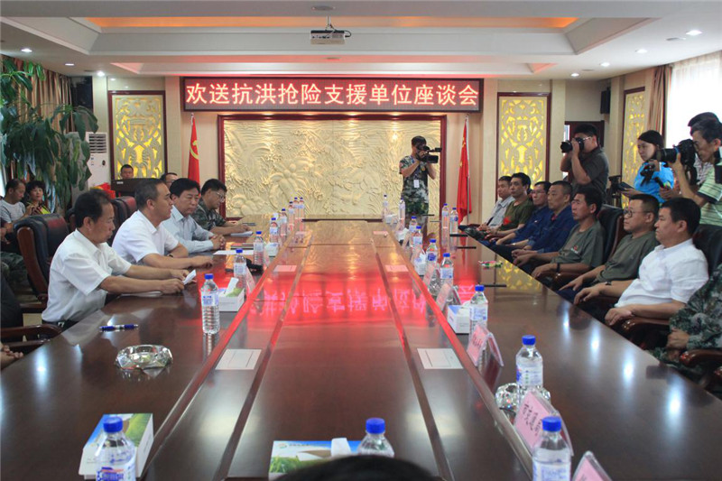 下午17时30分,市抗洪救灾指挥部座无虚席。欢送抗洪抢险支援单位座谈会隆重召开。吉林市副市长王雪峰、永吉县县委书记尚忠诚、吉林市建委主任卢晓峰等市县领导和抗洪抢险支援单位的负责人及市县媒体记者出席了会议。