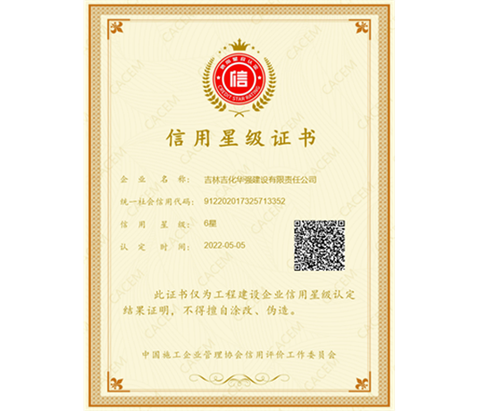 近日,中国施工企业管理协会信用评价工作委员会《2022年第一批工程建设企业信用星级认定结果的通知》最新公布,公司凭借良好的企业履约行为和信用表现,信用星级评为“六星”并获得证书。