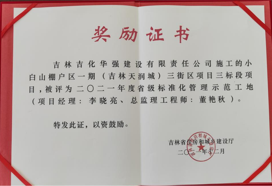 2021年度省级标准化管理示范工地——小白山棚户区一期(吉林天润城)三街区项目三标段项目