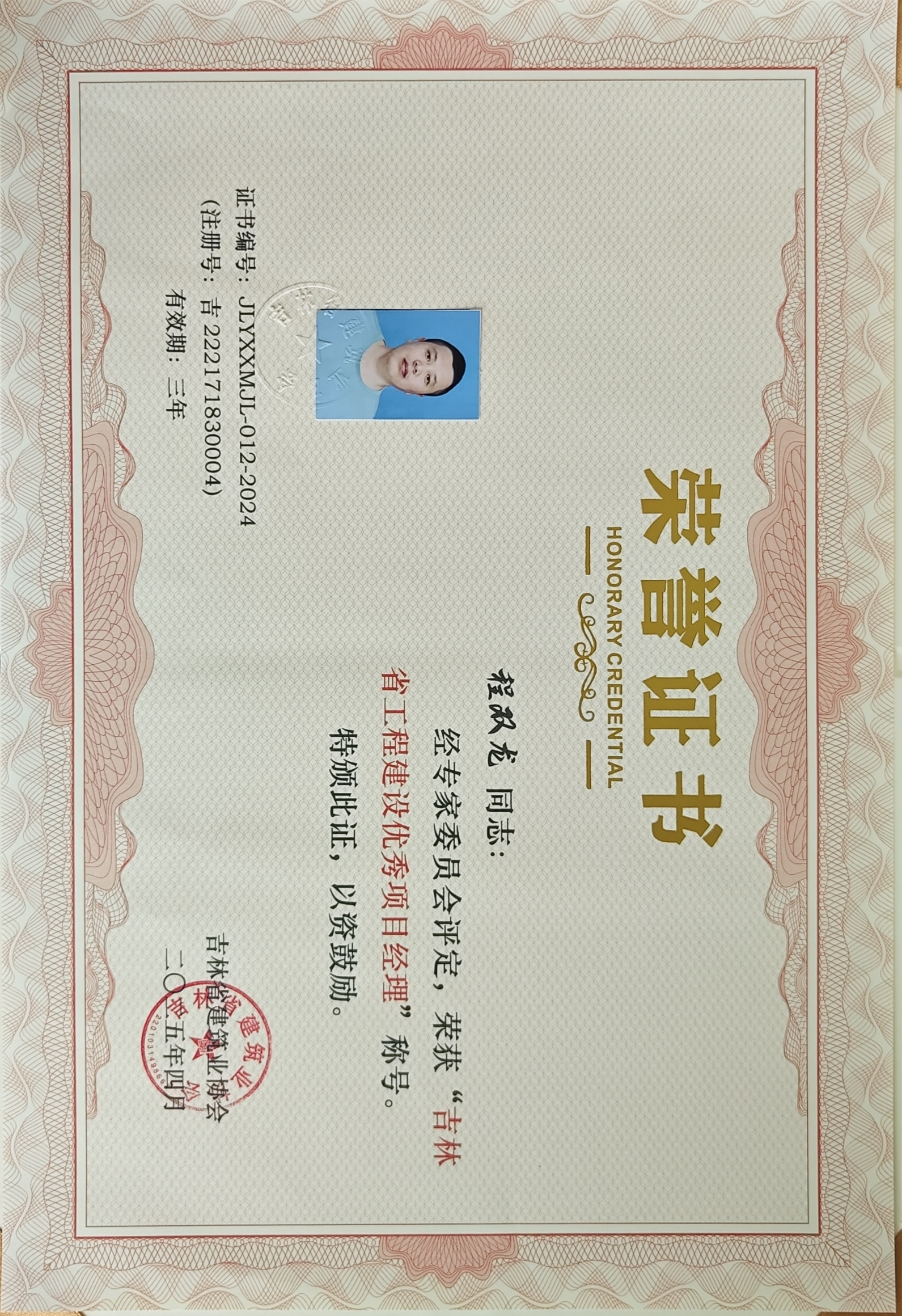 程双龙同志荣获“吉林省工程建设优秀项目经理”称号