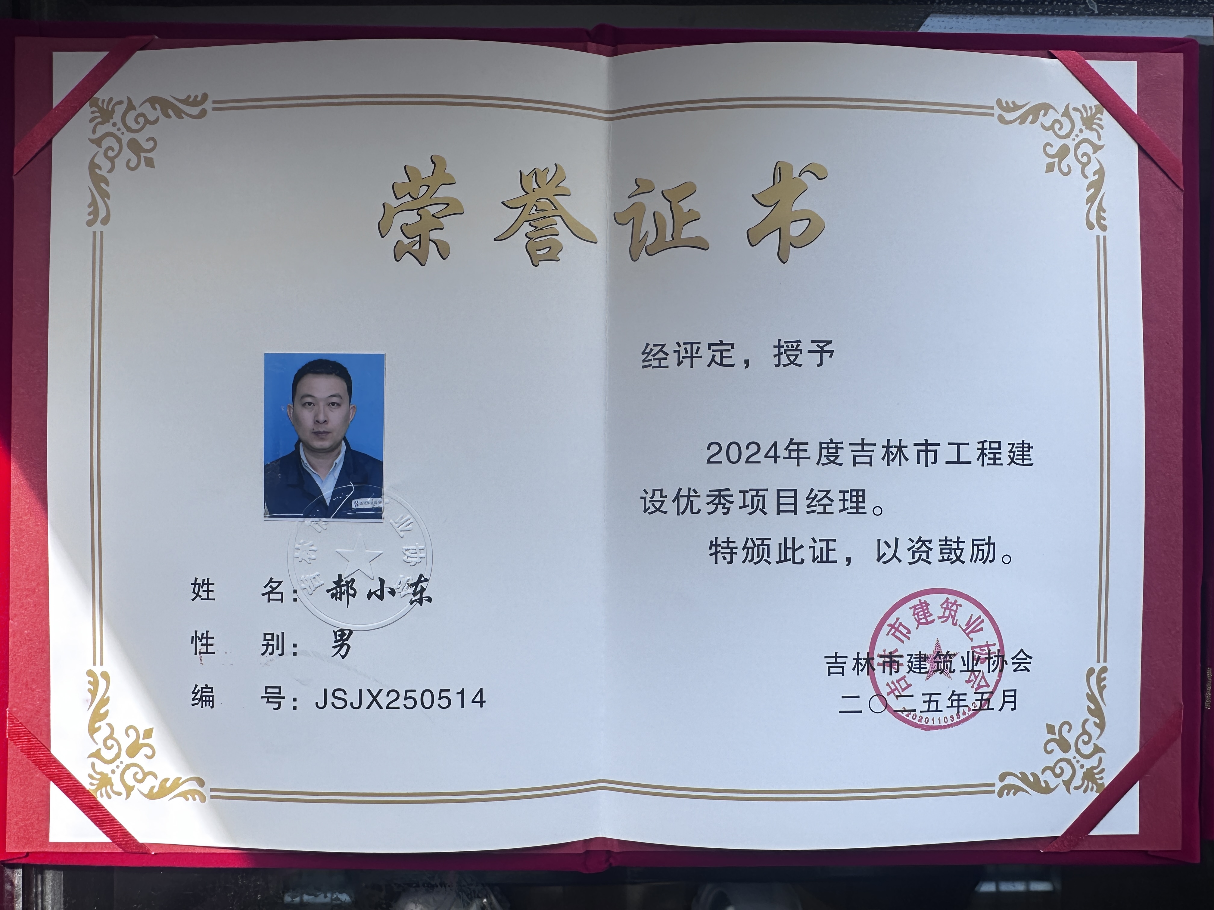 郝小东同志荣获“2024吉林市工程建设优秀项目经理”称号