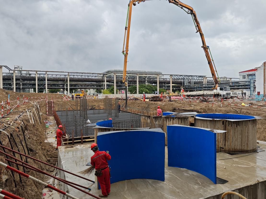 秉承各方领导“开工即大干、开局即决战”的方针,项目伊始即进入奋战阶段。阵阵暴雨浇不灭高质量竣工的希望,炎炎烈日燃出了完成项目的决心。目前页岩油项目已完成机柜间基础施工、部分大型设备基础施工等近15%的土建工程,项目部合理制定施工计划,力求加快施工进度,为后续设备安装、配管等专业抢出更多时间。在保证进度的同时,质量、安全也不可放松,为响应国家及公司“安全生产月”活动的宣贯,施工现场也组织了相关的应急演练活动,做到“安全在心中,事故去无踪”。