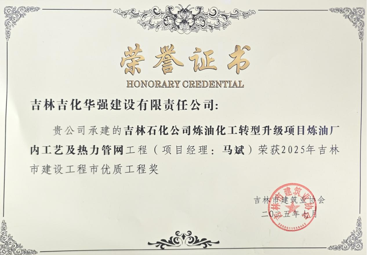吉林石化公司炼油化工转型升级项目炼油厂内工艺及热力管网工程荣获2025年吉林市建设工程市优质工程奖