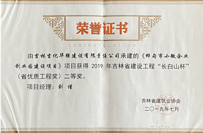 桦甸市小微企业创业园建设项目获2019年“长白山杯”二等奖