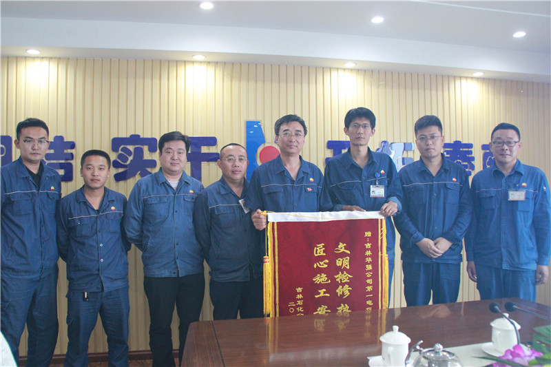 2018年7年29日吉林石化炼油厂仪表车间副主任郭子翔等一行三人将书有“文明检修 热情服务 匠心施工 安全优质”的锦旗送到公司