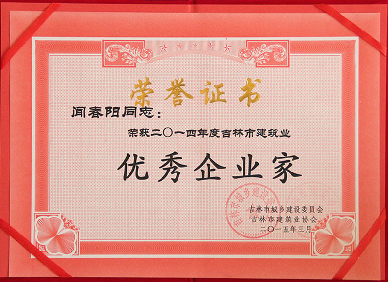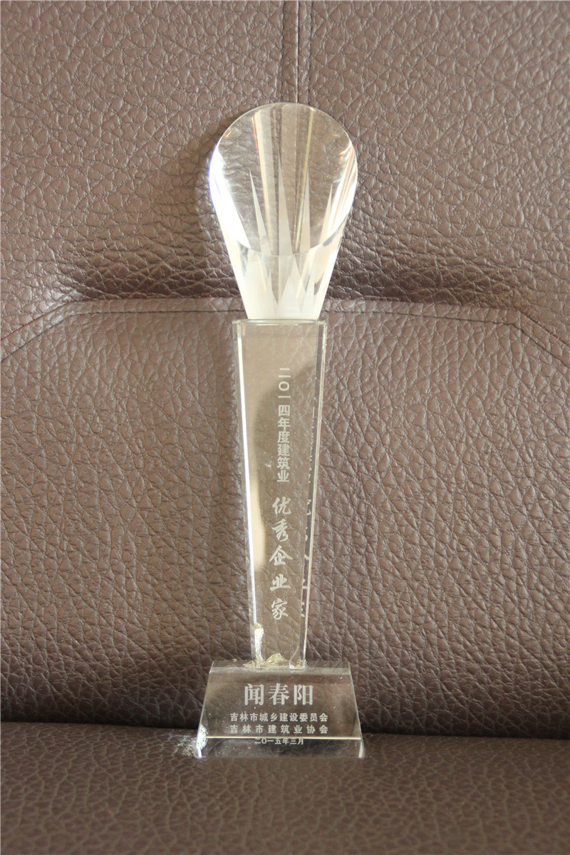 总经理闻春阳荣获2014年度吉林市建筑业优秀企业家(奖杯、证书)
