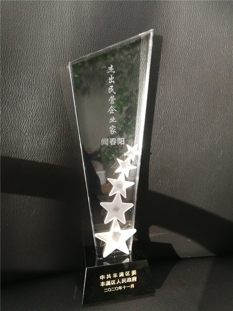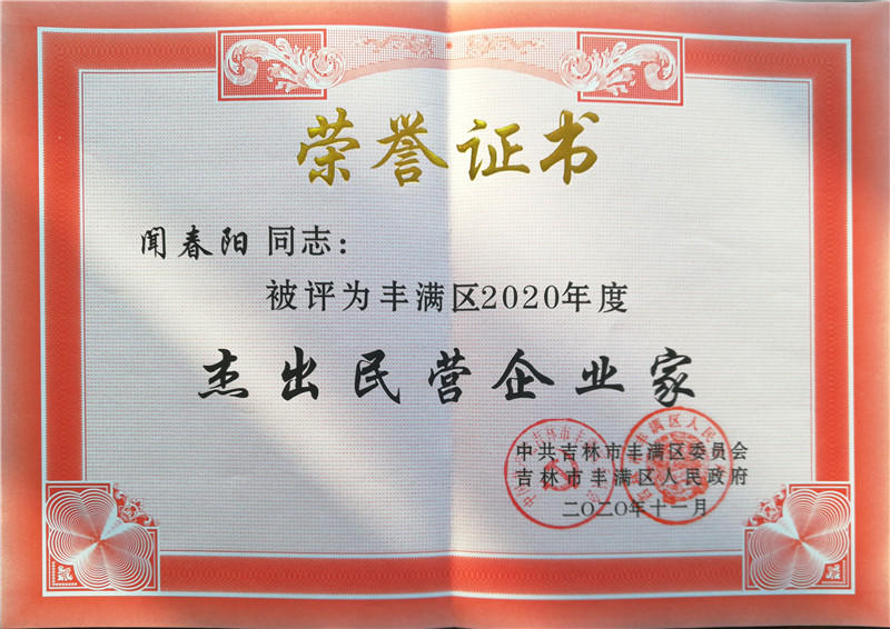 总经理闻春阳荣获吉林市丰满区2020年度杰出民营企业家称号(奖杯、证书)