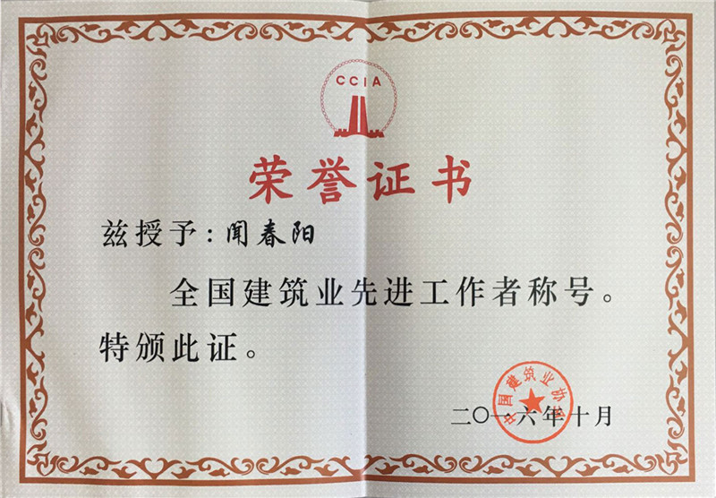 总经理闻春阳荣获2016年度全国建筑业先进工作者称号