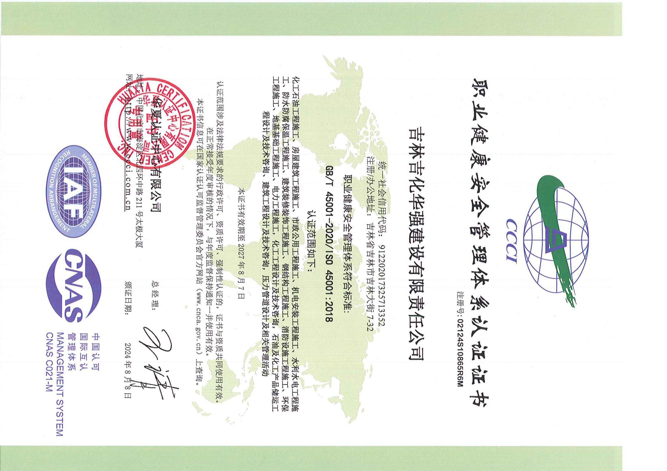 职业健康安全管理体系认证证书