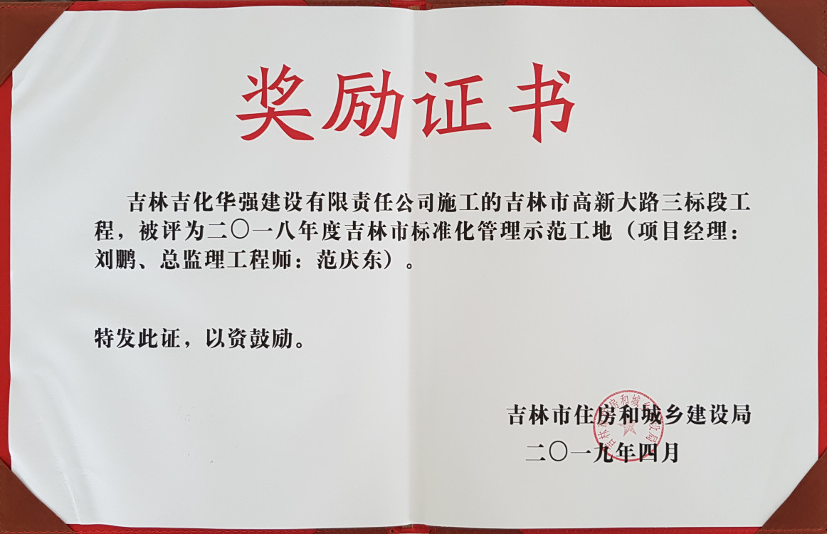 高新大路三标段-2018年省级标准化示范工地证书