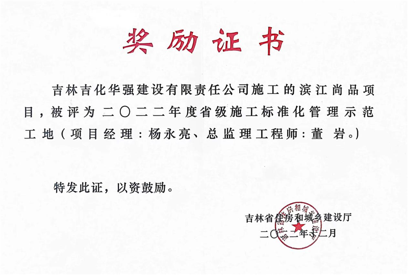 滨江尚品项目——2022年省级标准化管理示范工地证书