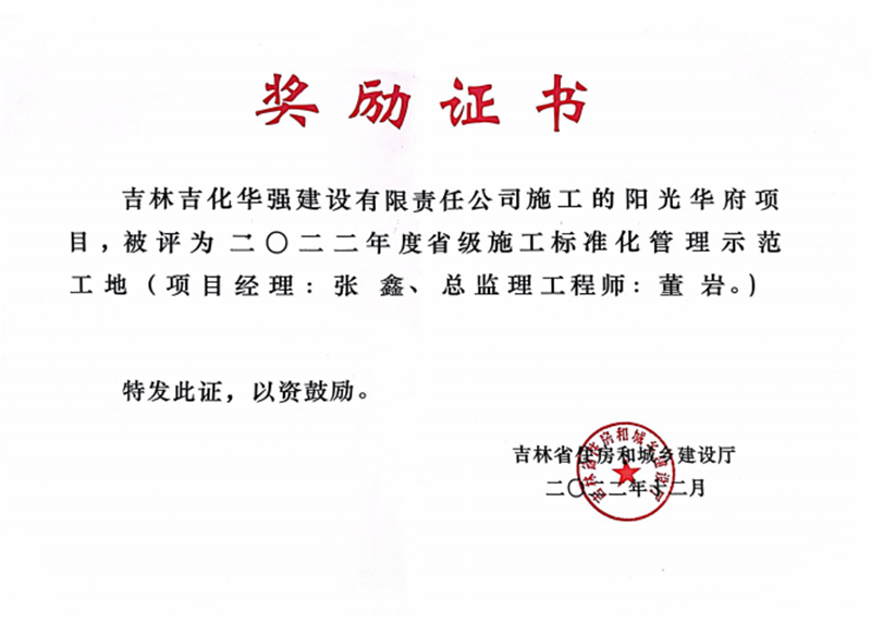 阳光华府项目——2022年省级标准化管理示范工地证书