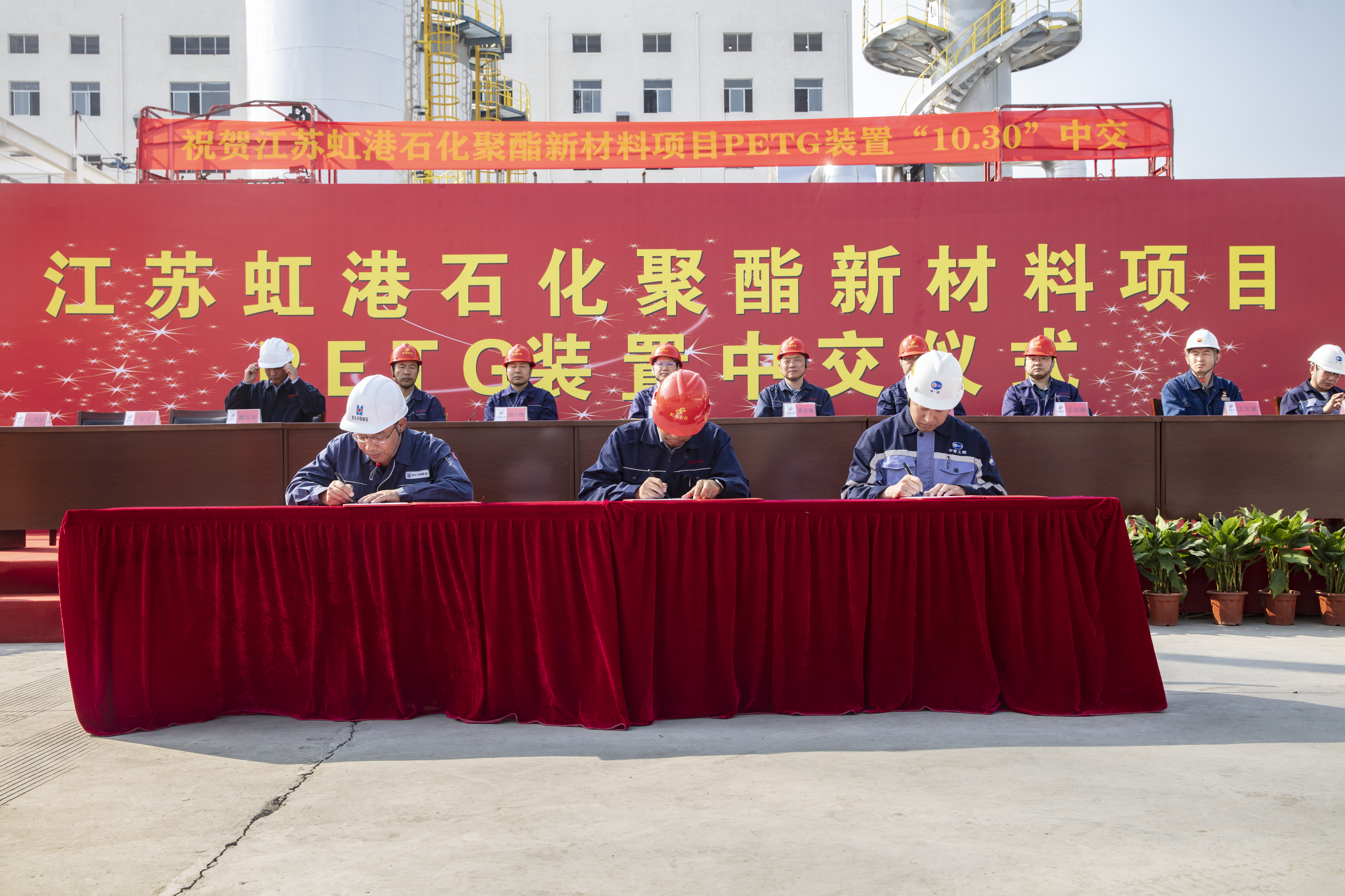10月30日9时56分,在聚酯新材料项目PETG装置热媒站北侧,江苏虹港石化有限公司工程管理部隆重的主持召开了聚酯新材料项目PETG装置中交仪式。公司以施工总包单位的身份受邀参加,同时参加的单位有江苏虹港石化有限公司(建设单位)、兰州石化质量监督站(质量监督单位)、欧瑞康巴马格惠通(扬州)工程有限公司(设计单位)、中咨工程有限公司(监理单位)。以总经理郭榜立为首的建设单位全体班子成员、公司副总经理王义及各出席单位的主要领导,共计11人主席台上就座。仪式方队由建设单位50人、监理单位10人、连云港项目部40人组成,共计100人参加。