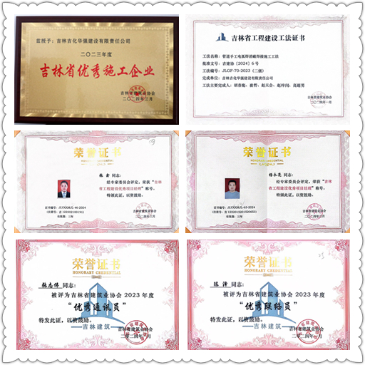会上对省内年度优秀施工企业、优秀项目经理等进行了颁奖。公司荣获“2023年度吉林省优秀施工企业”,所承建的吉林市阳光华府1#楼和永吉县钼尾矿综合利用产业园项目一期施工二标段新型建材生产车间1号厂房两个项目荣获吉林省优质工程“长白山杯”奖,杨永亮、张鑫两人获评省级优秀项目经理,由胡春彪、崔哲、赵梓闰、高超男等五人编写的《管道手工电弧焊消磁焊接施工》工法获评省二级工法,张志伟被评为优秀通讯员,陈泽被评为优秀联络员。