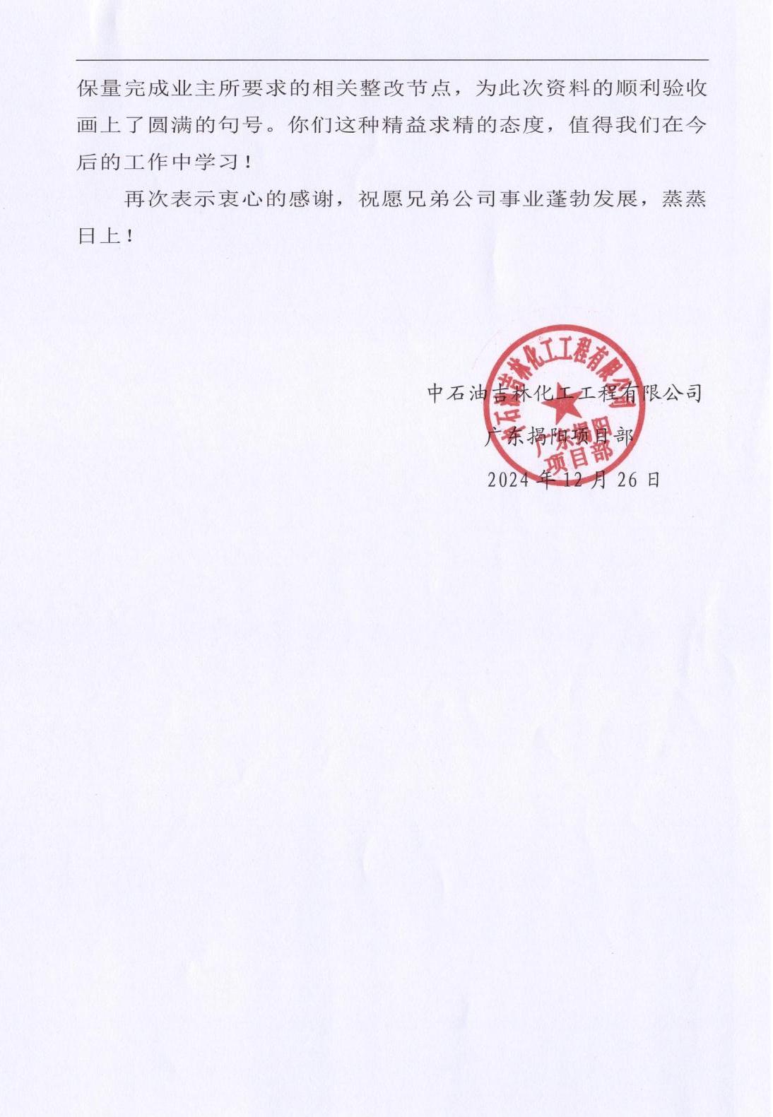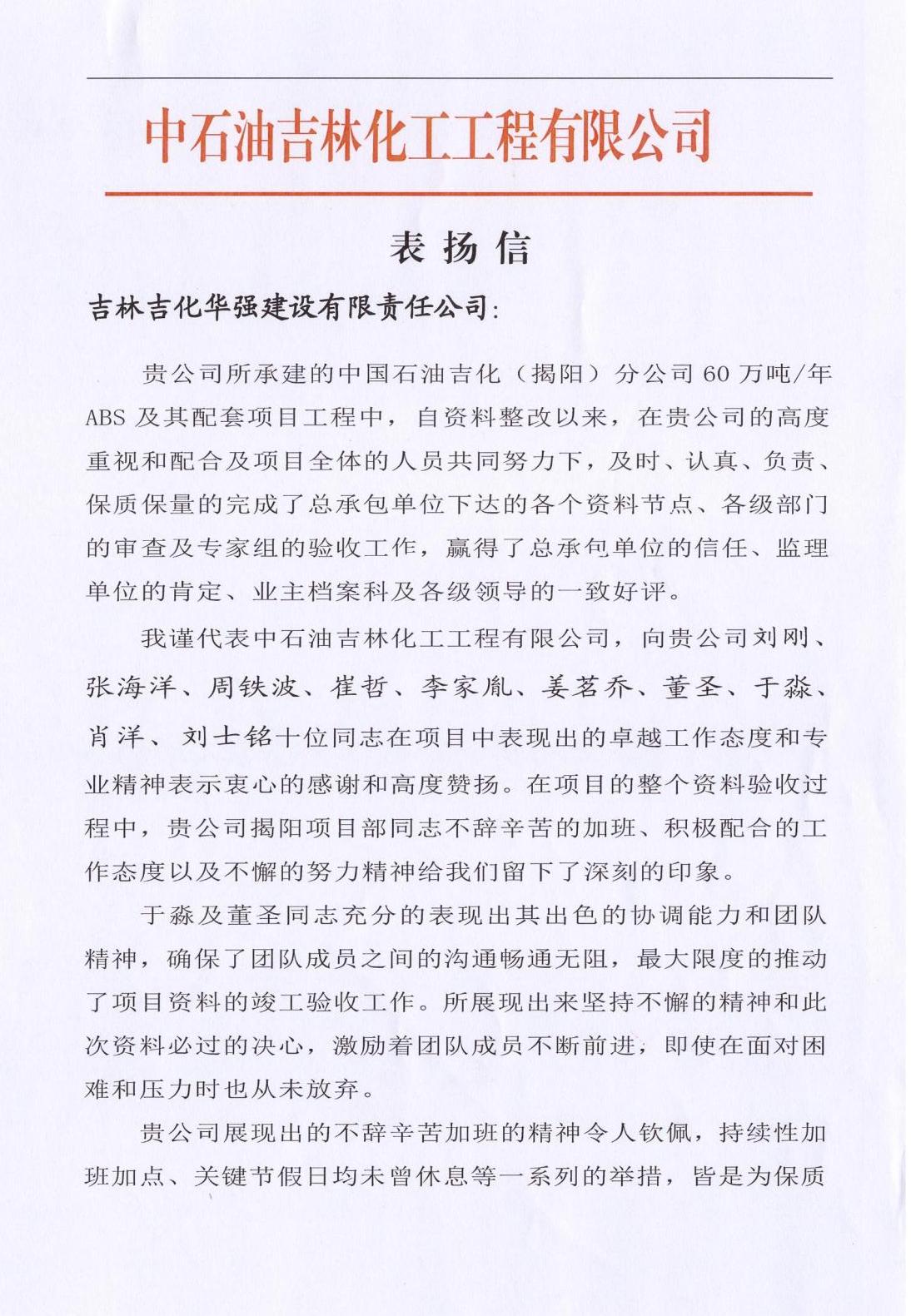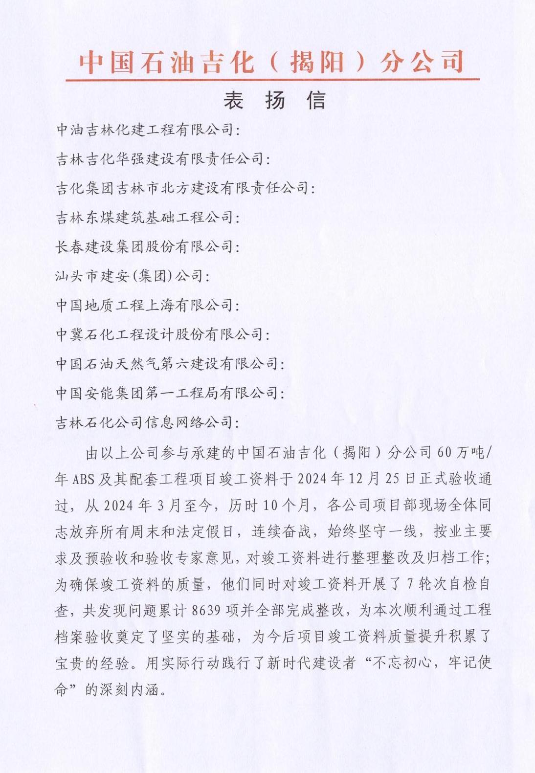 这一过程中,不仅赢得了总承包单位的深切信任,也获得了监理单位的积极肯定,更在中国石油吉化(揭阳)分公司的业主档案科及各级领导中赢得了广泛而一致的好评,先后收到了中国石油(揭阳)分公司及中石油吉林化工工程有限公司的表扬信。这不仅是对华强人专业能力和工作态度的认可,更是激励华强人继续追求卓越、精益求精的动力源泉。未来,第一分公司将继续保持这种高效、负责的工作态度,为公司及其他合作伙伴贡献更多优质工程,携手共创更加辉煌的业绩。