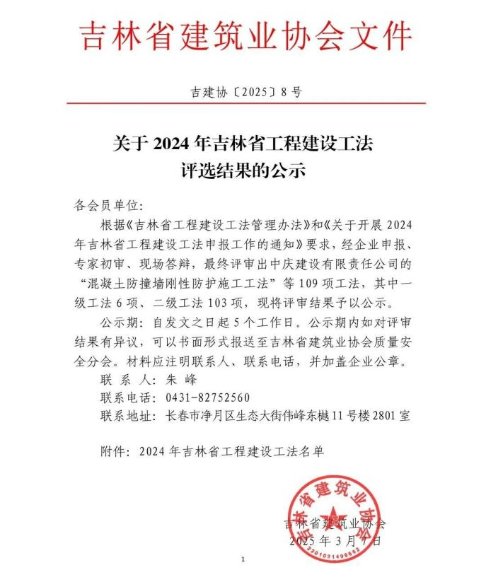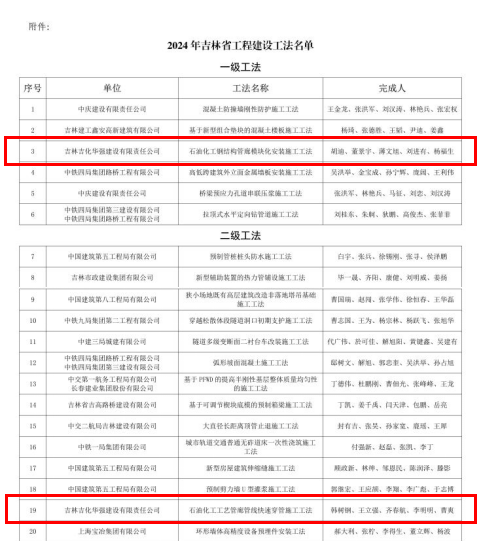 公司在2024年度吉林省工程建设工法评选中成绩斐然,成功获评两项省级工法。其中,《石油化工钢结构管廊模块化安装施工工法》荣获一级工法,在省内排名第3,这是公司首次获得一级工法。《石油化工工艺管廊管线快速穿管施工工法》获评二级工法,省内排名第19。